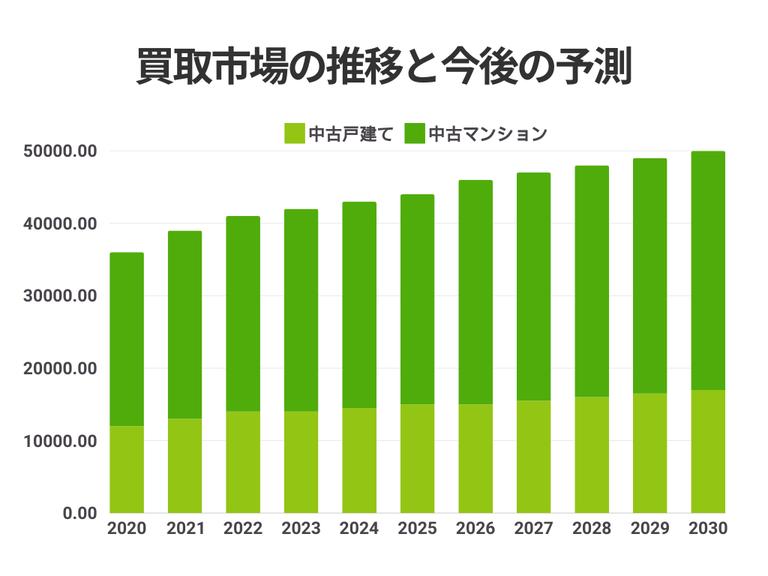 上記のグラフは買取市場の推移と今後の予測を戸建て・マンションそれぞれ表したグラフです。