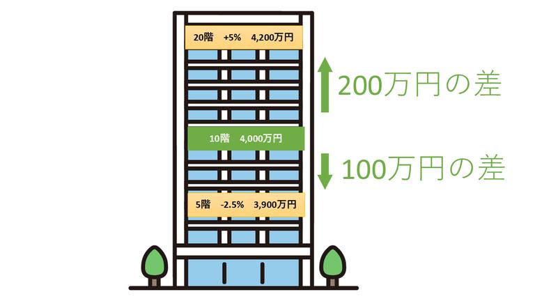 例えば、20階であれば+5%で+200万円の高く、5階であれば-2.5%で-100万円ほど価格が変化します。